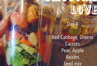 For this smoothie I used Red cabbage, greens, carrots, pear, apple, raisins, cucumber, seed mix and almond milk. Whilst there is quite a bit of vegetables, the fruit and raisins adds the sweetness, a great way to start the week.
