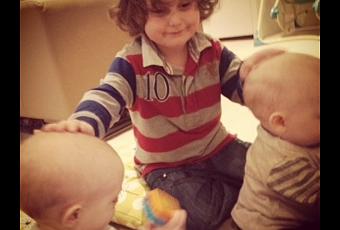 Ben is a very proud big brother and loves plating with "his babies". The twins absolutely idolise him of course and light up around him. I took this photo of all three of them today while Ben was helping Zoey and Zachary play with their alphabet train. It's lovely one they've reached the stage that they can start playing together.