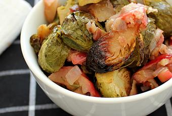 Heat oven to 400 degrees. In a large bowl, toss Brussels sprouts, red onion, crabapples, and bacon all together. In a small bowl, whisk maple syrup, vinegar, olive oil, and rosemary. Pour the maple syrup mixture over the Brussels sprouts and coat. Season with salt and pepper to taste. Place on a baking sheet or 9 x 13 baking pan and roast for about 35 minutes, until the sprouts have cooked through and have developed some nice caramelization.