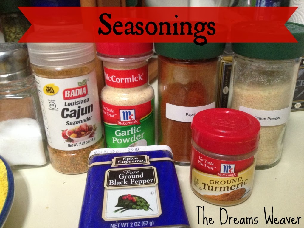 Seasonings:½ tsp. salt1 tsp. cajon seasoning3 tsps. garlic powder3 tsps. paprika2 tsp. onion powder½ tsp. ground black pepper1 tsp. ground tumeric