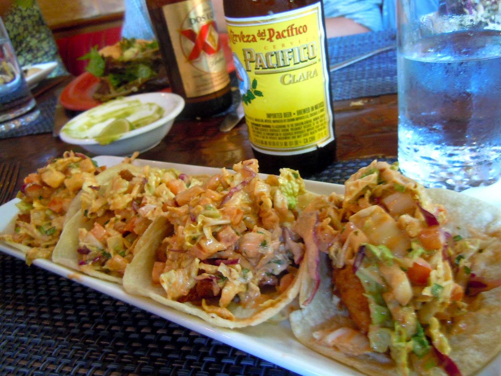 [Pacifico, guacamole, tacos al estilo baja (crispy beer battered mahi mahi, mexican style coleslaw, chipotle aioli)]