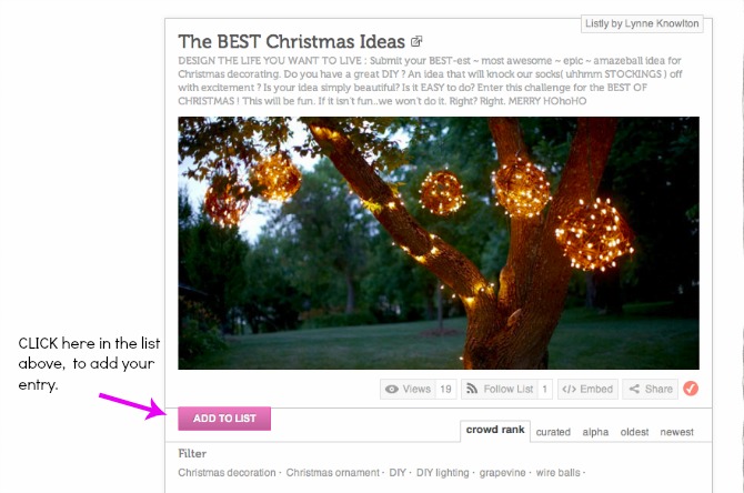 Not a blogger ? No worries, anyone can submit an entry. Bust a flurry. Have some kicks. Throw back some eggnog…CREATE…take a photo and submit it……let’s see those epic CHRISTMAS IDEAS. Just click add to list in the contest above, and it will prompt you on what to do for submission. Freak balls easy to do.