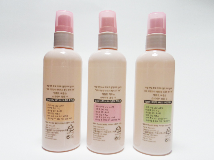 1. I'm Blooming Deep Moisture MistUsing this mist provides instant hydrating relief to the skin, locking in long lasting vital moisture with 81.9% Rape Flower Honey Water. That makes you worry free from dryness and stickyness.2. I'm Blooming Brightening MistThis mist contains 93.9% Flower Water that brightens up dull and exhausted skin and smoothes out rough texture, providing a clear milky white complexion. With ingredients that strengthens skin's natural vitality. This mist helps maintain fresh, blooming & healthy skin.3. I'm Blooming Sebum Control Mist This mist has 95.9% of Green Tea Water which holds the greasy skins' excess sebum & fills up the lack of moisture. Also helps to maintain the best skin moisture condition.