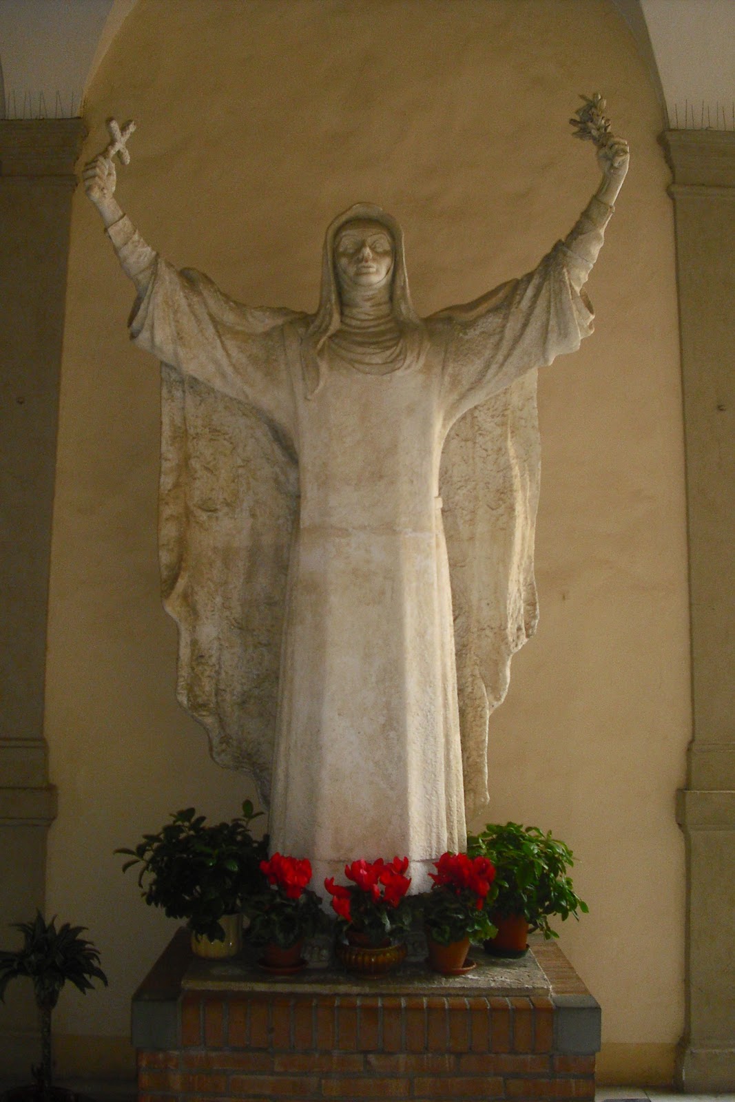 After the long climb back down, during which I almost trip and twist my ankle, I sit in Piazza del Campo and read my map whilst drinking an espresso. I had previously written down that I should visit the Sanctuary of Saint Catherine of Siena, so this is where I head now. On the way I stop at a beautiful candle shop where a couple of women are crafting away with hot wax, and purchase a candle moulded into the shape of an owl. The Sanctuary of Saint Catherine is basically a small church, but it is set high up in the winding Sienese streets and offers a lovely view. Here is Saint Catherine herself, guarding the entrance to her casa, and the panorama of Siena that I found around the corner when I visited the Basilica of San Domenico: