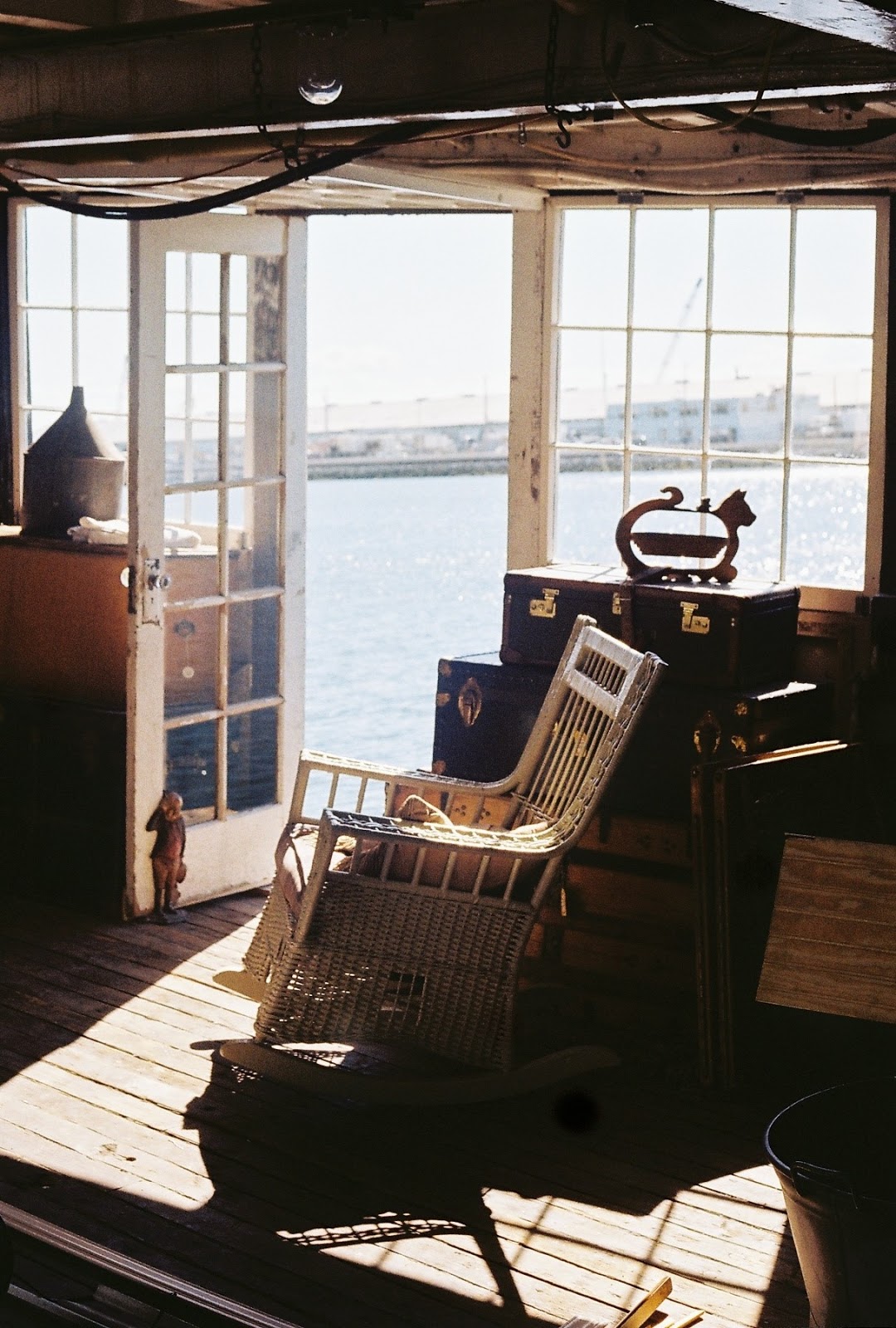 As I type this, I'm sat half in the doorway between the Passenger Gallery and the deck, the slow and humming American sun gradually turning my limbs a dusky pink. Above, the reflection of the water dances in silver shimmering spectres across the wood-panelled ceiling. Across the water I can see a couple sitting on a giant boulder, a girl playing ukulele and them both singing.Let me tell you about my new life.