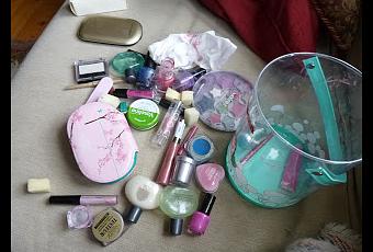 She applies to cosmetics the same technique that she uses for her splatter paintings. Now and then she swabs the splashback off with a tissue soaked with spittle.