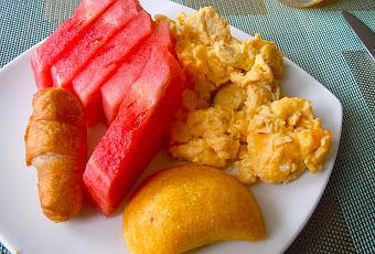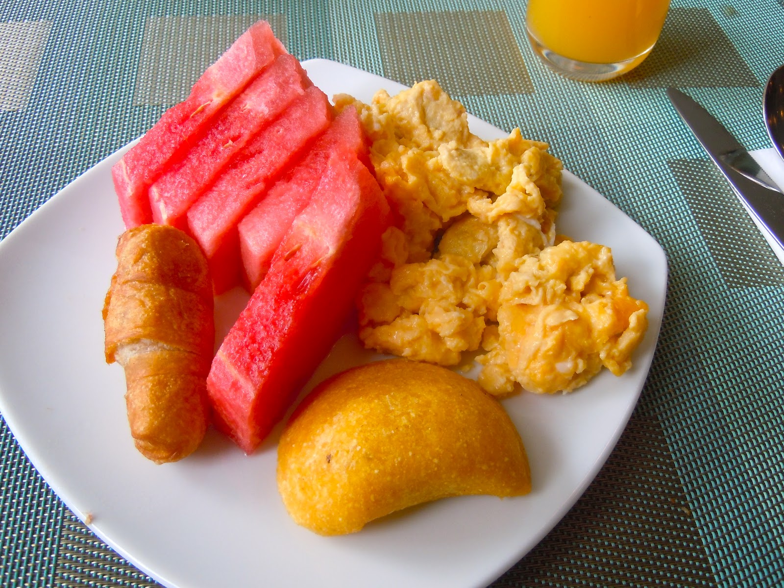 Come back to Medellín with me, where my grandmother and I were staying at a business hotel with a killer breakfast buffet. On that Monday, I had a glass of fresh-squeezed orange juice with scrambled eggs, fried yuca, and sliced watermelon. Then we walked to meet the Turibus for a spin around the city.
