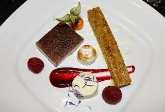 This was a trio of pistachio and olive oil cake, soft meringue, chocolate creme blur and yogurt wanna cotta with raspberries.