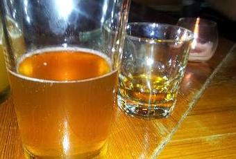 You’re looking at my (1) a pint of Magic Hat #9 and (2) a shot of Michters [with three cubes] – a decent rye with a mildly fruity nose, and a fairly smooth finish. Coincidentally, Michters is one of the oldest distilleries in the U.S. – dating back to before our independence.