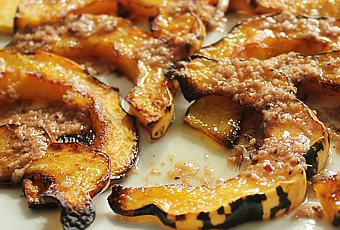 To roast the squash: Heat oven to 400. Place the slices of squash on a baking sheet (I line mine with a Silpat). Drizzle with a tablespoon or so of olive oil and sprinkle with a pinch of salt. Roast for about 10-15 minutes then flip the slices. Once those have become nice and brown as well, take out of the oven and drizzle with desired amount of the gingery brown butter mixture.