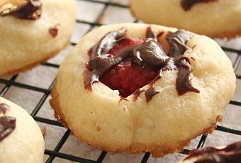 Using electric mixer, cream butter and sugar. Add in extract. Slowly stir in the flour. The mixture will look sandy at first, but the dough should come together, just keep the mixer going. Feel free to add just a touch of milk if it doesn't seem to come together. Refrigerate for at least an hour. Form into 1-inch balls. Use the handle of a wooden spoon to press an indentation into the ball. Fill with either the apricot spread or place a raspberry in there. Bake at 350 for about 15 minutes, until the edges are lightly browned. Cool for a minute on the tray then move to a cooling rack. Combine chocolate chips and cream in a microwaveable bowl. Carefully microwave for 30 seconds, or until the mixture is melted. Stir in the almond extract. Drizzle chocolate mixture over cookies. Add toasted almond slices to each cookie, if desired.