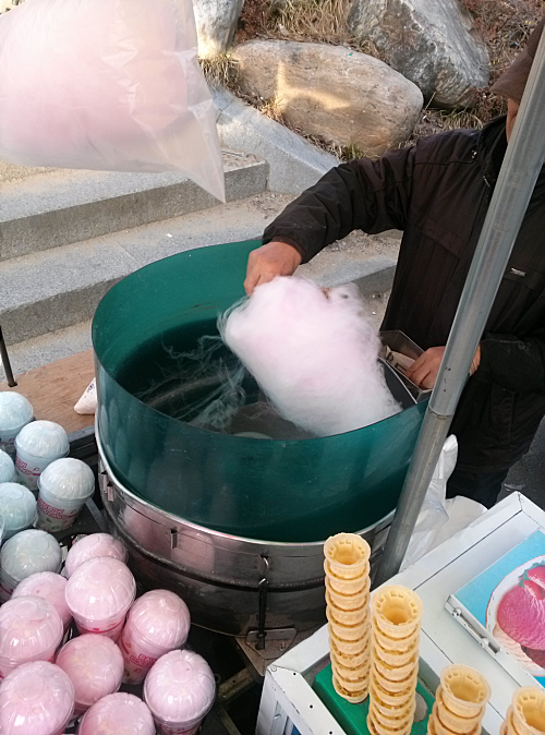 아저씨 making a pink cotton candy. He sells ice cream too!