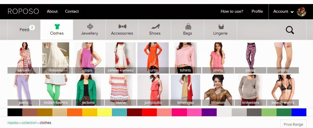 I have already mentioned in my previous posts how much I enjoy it. Still at times I find it difficult to surf for products in more than one site. So I simply stick to one site to do my shopping and at the end, I look at my friend’s collection who bought from some other online store and then I regret I should have checked that site too... Sigh!Can I say this luxury eventually makes me too lazy to surf different sites? Hmph, as the time and technology evolves we demand every thing to be easy n simplified. So don’t blame me for being such a lazy rat. :PI was really wishing for an online mall where we go, surf and pick our desired attire ~ all under one roof.That’s when Roposo invited me to visit their site. Claiming to be the best search engine for Women’s Clothing and Accessories, I must admit I did find it quite interesting. Roposo.com is a social platform dedicated to women's fashion where we can search and discover products of our tastes from across the web. Hah.. my wishes came true now.Roposo has teamed up with best fashion websites delivering in India like Limeroad, Jabong, Nineteen, Flipkart, Koovs, etc., and in this way the up-to-date women’s fashion can be found under one roof. As I said, its like a mall where our time and energy saved from the hassle of browsing through multiple sites. They have done detailed categorization which helps in fetching the products easily. One feature I am impressed with is ~ the color options they offer.