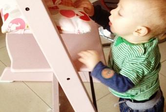Zachary never stops surprising me these days. I was cleaning up the mess that is the lunchtime aftermath today when I turned around to find him standing at Zoey's Tripp Trapp scavenging for any leftovers. He seems to have gone from rolling about on the floor to crawling to standing like this in record speed.