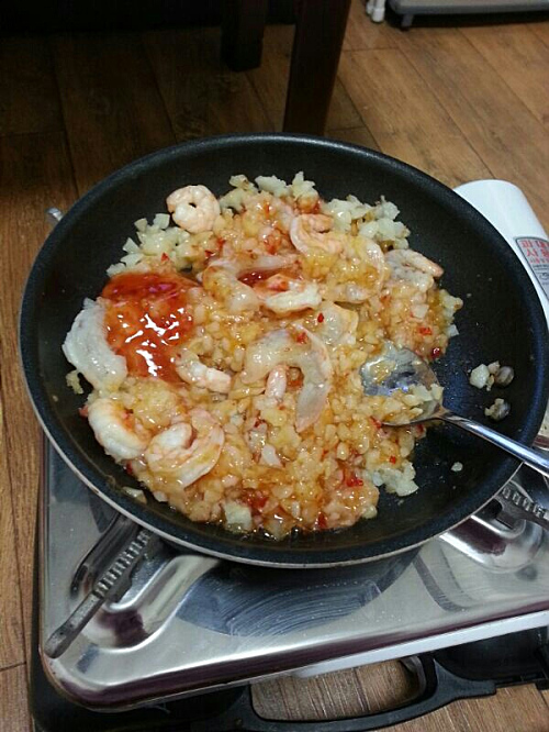 Heat oil and butter in a large pan & cook the hash brown and shrimps for about 1-2 mins. then stir until golden brown.