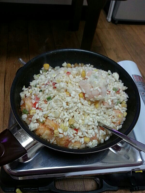 Just the time when hash browns and shrimps turned golden brown, we added mixed veggies and rice. Stir until the rice coats in the oil.