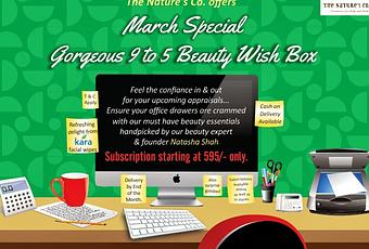 "Impromptu outdoor meetings or after-work plans, ‘freshening up' or touch-ups become inevitable. These emergency fix-its have slowly filled up my desk, and I refuse to part with a single one, making me look and feel my best at all times. You’ll be ready for anything!" shares, Natasha. She decodes some inside tips to keep you feeling gorgeous, confident and ready for any challenges the day might bring. Here is her daily beauty checklist:1) Hydration: Keeping yourself hydrated keeps your body and mind active and fresh. Always have a bottle of water on your desk. Replace teas and coffees during work hours to green tea and lemongrass tea.2) Moisturisation: Outdoor meeting and continuous air condition at work leads to skin dryness and damage. Treating your skin with the apt amount of moisture is necessary. Never skip your body lotion, day face cream, lip balm and hand cream quick retouches at work.3) Quick Fixes: To freshen up anytime of the day a good face wash in your bag is a must have. When on the go wet wipes always help.4) Grooming: Being well groomed helps to boost confidence level. Always keep a nail file, tweezers, an extra hair clutcher and hair ties handy to be looking perfect at any time.5) Me - Time: Long hours in front of the computer screen causes a lot of strain to your back, neck and posture. Ensure you occasionally break into simple neck exercises and feet stretches to relax your muscles. *Personal Tip* : Take a break from the screen. Make sure you get up every hour for a few minutes and walk around your office. Avoid calling / emailing your colleagues, instead walk up to their desks, get up to get a drink, go near the window for some fresh air or get up to get your print or photocopy.Find the handpicked recommendation in our March Special Gorgeous 9 - to - 5 Beauty Wish Box.