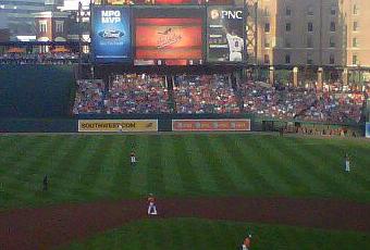 Second, the pitcher’s out there in the middle of the field all alone. There was a sold-out crowd there on Saturday night, something Camden Yards hasn’t been accustomed to since the days when I was there: when it was new and Cal was breaking records or Davey Johnson got us to two consecutive playoff berths in 1996 and 1997. So, there’s a pitcher, on the mound, alone, with people all around him. And yet, even with the distractions of the wave, the Bird dancing on the dugout, people shouting obscenities, and just the general crowd noise, he’s required, again, to throw those strikes across the plate. His team is scattered across the lawn, and there he is, a lone soldier, trying to get men to swing. And miss.
