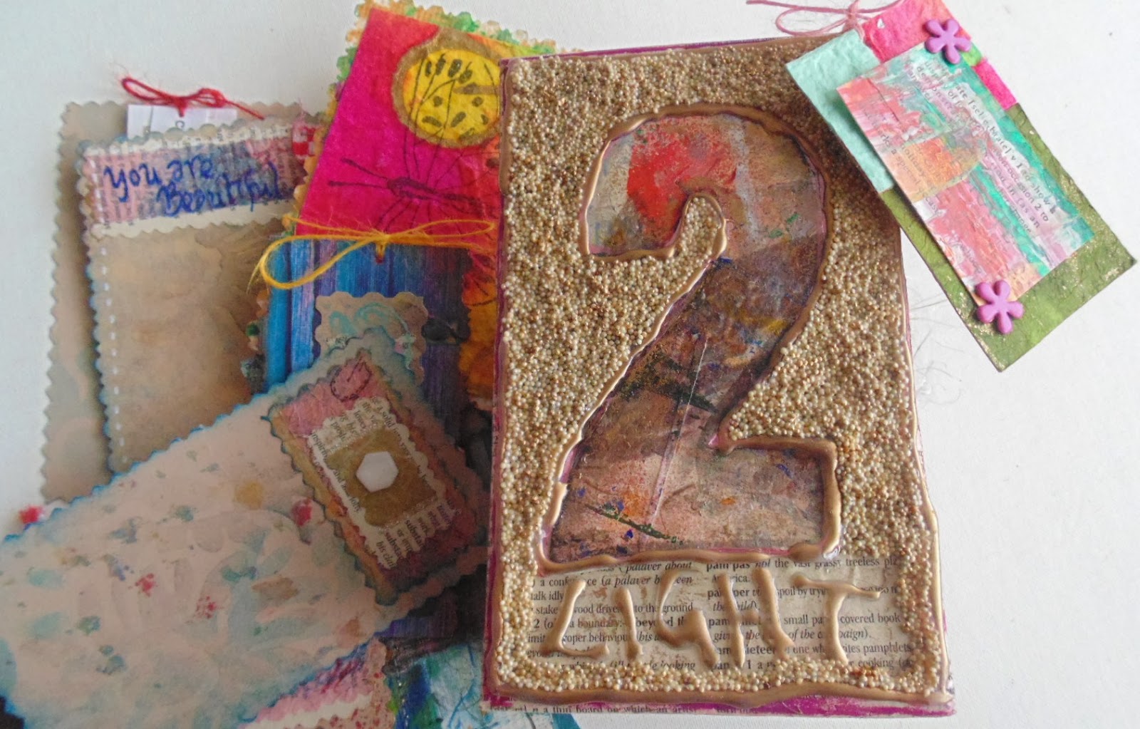 My plain quinoa was passed its' sell by date for consumption, so I thought it would be great to add a bit of texture on some of my pieces. The one above has a few linseeds in them from an earlier experiment, you can use them in their natural state, or as in the little bags you can color the quinoa using acrylic paint.