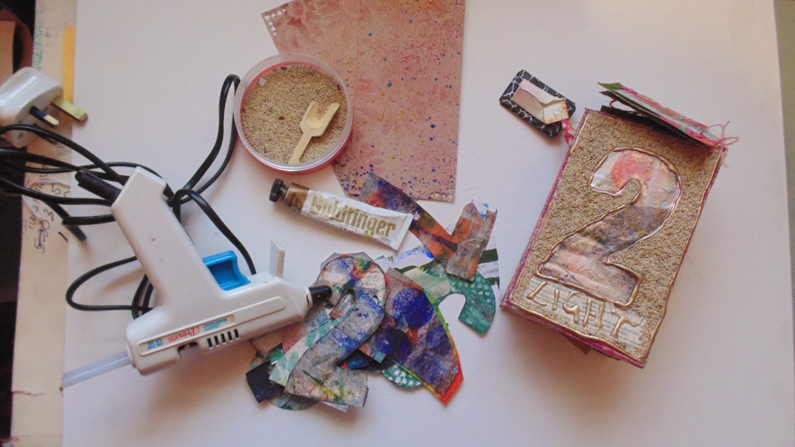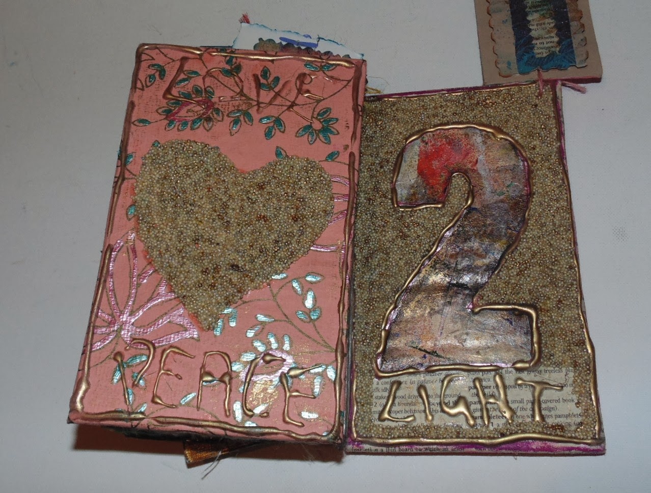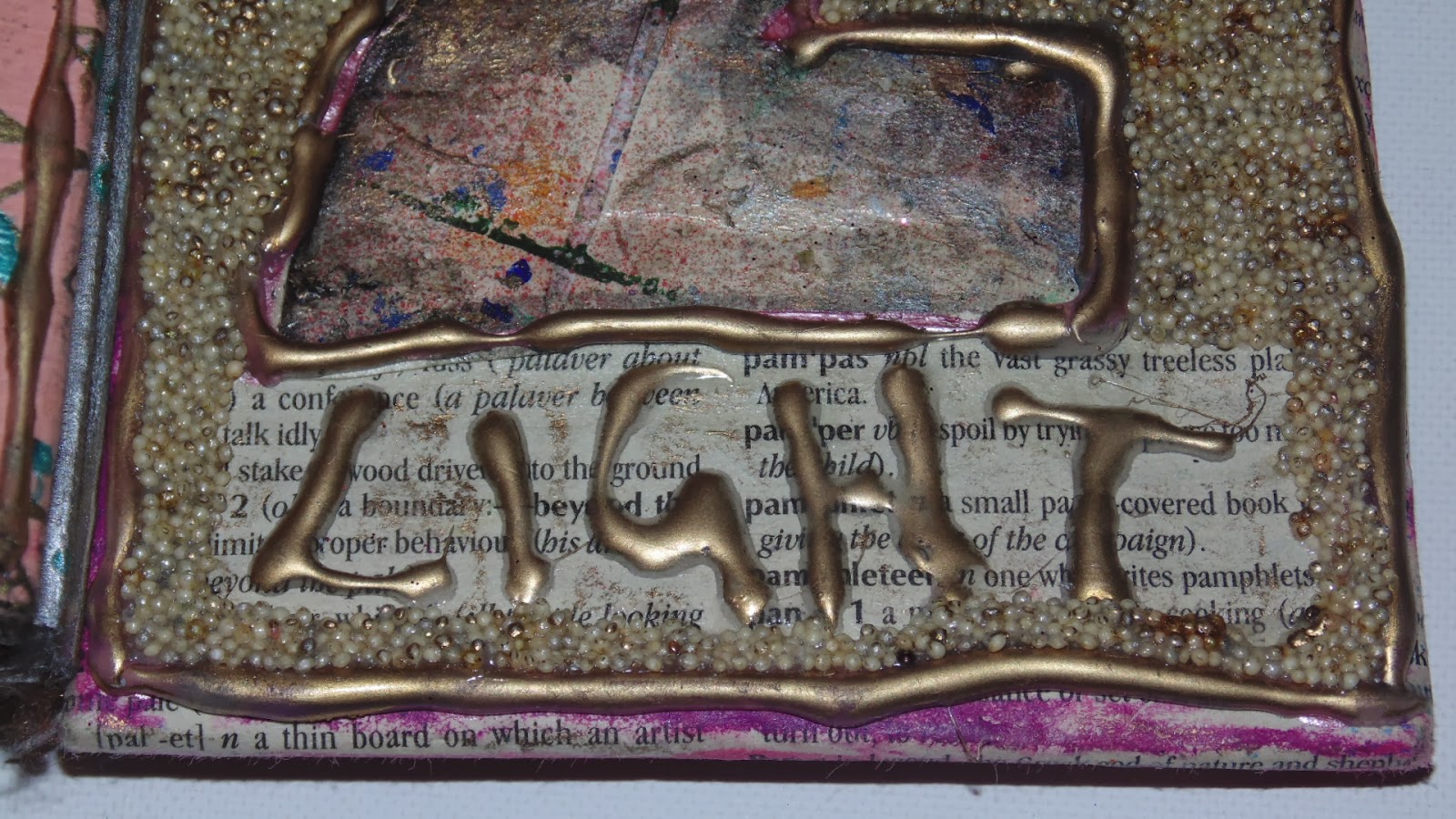 After they both had dried I used goldfinger metallic paste around the dried glue words and borders and on some of the quinoa in the spaces.