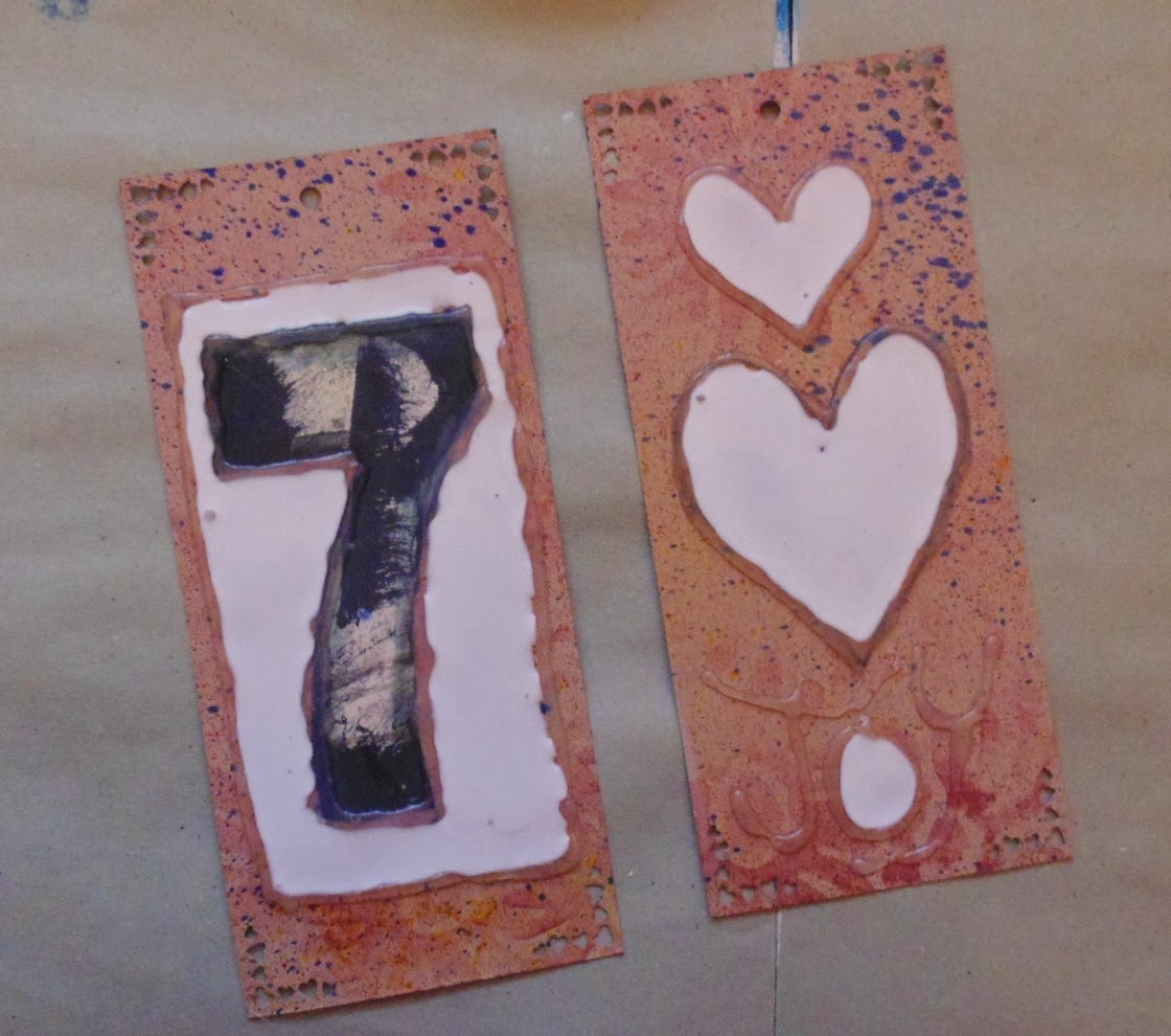 Taking the glue gun on one of the tags I wrote out the word Joy and drew two hearts and on the other one I stuck the number 7 made from recycled paper.
