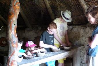 The boys make bread at Castell Henllys fort.