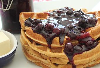 Most little ones seem to have favorite toys or favorite stuffed animals. And favorite colors. But not our little guy Max. He is rather fickle, dispensing his affection on whatever catches his fancy at the moment. Or maybe he just kinda likes his toys, stuffed animals and colors equally. But he does have a favorite letter. Okay, 2 letters. He loves both B and O. And b is just so super awesome because it's also his word for berries. And it doesn't hurt that b is the first letter of his very favorite thing in the entire world - buses. Now, he loves all berries, but you never know what berry he will actually want to eat that day. You see some raspberries on sale and pick up a few cartons, thinking, ohh Max will like this. No, no, he will not. He will want blackberries, not the raspberries sitting in the fridge. But sometimes, sometimes, the stars align all beautifully straight in a row and the kiddie gods smile beatifically upon you and somehow you get the right berry (or B, as it is known) to make him happy. And since it was his birthday the other day, I made him some waffles with B's. And it must have been the right B, because he was shoveling the sauce into his mouth. So thank you gods of toddler eating, we totally appreciate it. And, I'd have to say these waffles are pretty great for full grown people as well.